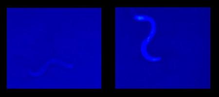 死にゆく線虫に紫外線を当てて観察することで、死の過程で青い蛍光が放たれることがわかった。この光は次第に強くなり、死の瞬間に最大に達し、直後に消えるという。この研究は、細胞死遅延薬の開発に役立つ可能性もある。