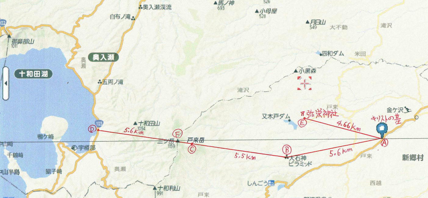 なんとまあ~?こんなこと人間が計算できるのだろうか?コンピューターがあればだけれど、1500~2000年前のことだからな~?キリストの墓と言われるものがいつ出来たか分からないけれど。AとEの距離4.66kmは、FとDの距離に等しい。CとDはAとBに等しい。BとCもほぼ等しい。それにキリストの墓の緯度が、蝋燭の火の形の半島の先端に合っている。何のために?本当にこんなこと人間が出来るのだろうか?八甲田山から南東に45度ピッタシというだけでも大変なことなのに。さらに山との角度を調べてみた。????!!!!!です。