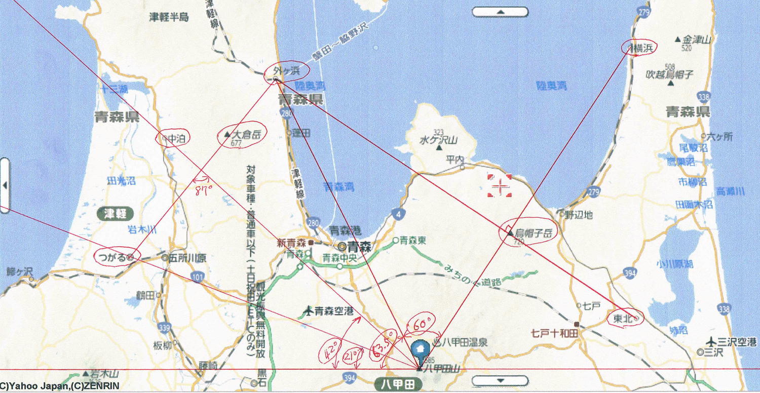 もし結界を張るということなら八甲田山は北方向に対して張っていることになる。八甲田山と十和田湖からは東と東南方向に対して。岩木山は北東方向を含めて結界のボス的存在だな。まあ、それにしてもどうなんでしょう?青森、恐るべし!!!西方向が無い。きっと新潟当たりにあるのではないだろうか?白山当たりは北東向けかも知れないな。南向きは須波阿須疑神社になりますね、きっと。それにしても八甲田山から21゜、42゜,63.5゜の方向に町がきちんとあるとは。63.5゜も少しずれれば63゜になる。町が方向でなくその中にある神社が方向を示しているのだと思う。だから、21゜、42゜、63゜で建てられていると仮定して良いと思う。結界と星の観察ですね。結界というのも星や太陽の位置と連動している可能性はある。そして神社の周りに人が住むようになった。人が住むことで神社が守られるし、神様によって守られている所は安心感があって人が住みよいというのは人間の自然感情としてあるな。
