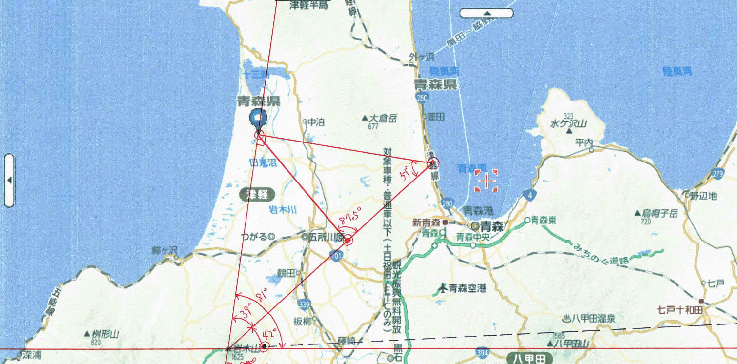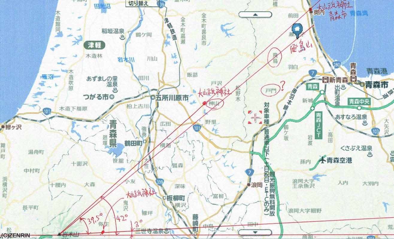 えっ、どうしてこんなところに大山祇神社が?青森に5ヶ所も。うち二つは42゜線上に乗っている。ひとつは3゜線に、もう一つは南向きの36゜線にピッタシと。まるで角度確認基準点のごとく。この42゜線に乗っている2ヶ所は、鬼門方向からの霊的防衛なのかな?それは私には分からない。そして三つの大山祇神社を繋げるとこうなります。いやはや、ですね。岩木山麓の大山祇神社と、三沢より少し南のつがる市にある大山祇神社を繋げるとピッタシ!緯度線(春・秋分線)になる。その線は八甲田山の頂上を通る。”いやはや”の二乗ですね。