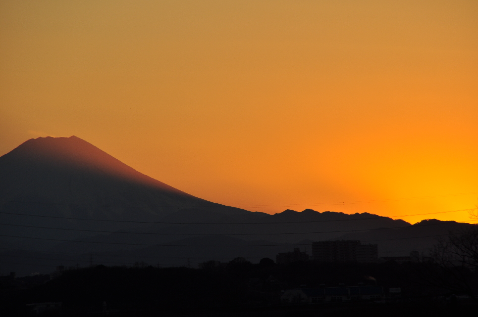 荒川土手からの富士夕景。昨冬は富士山が珍しくしばしば荒川土手まで自転車で走ったが最近は自転車でわざわざ寒い中を走るのが億劫になってきた。今日、雲が無く遠くまで澄んでいたので久しぶりに走って写真を撮ってきた。途中の建物が目立たないように撮るのが難しい。