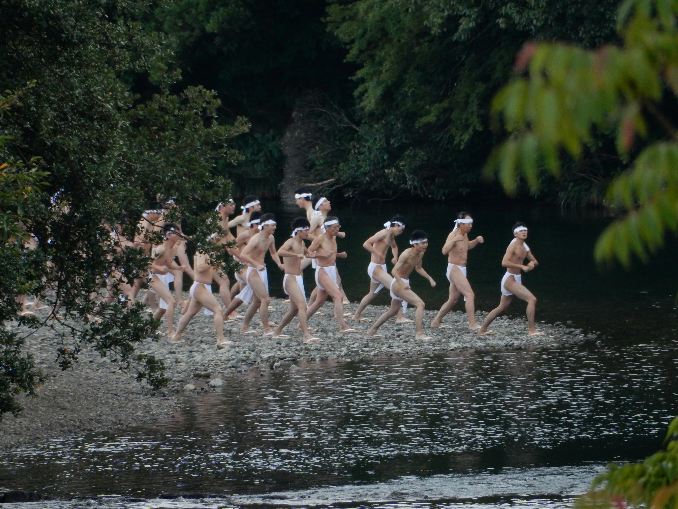 15日若手神官達の五十鈴川での早朝の禊ぎ前の船こぎ運動