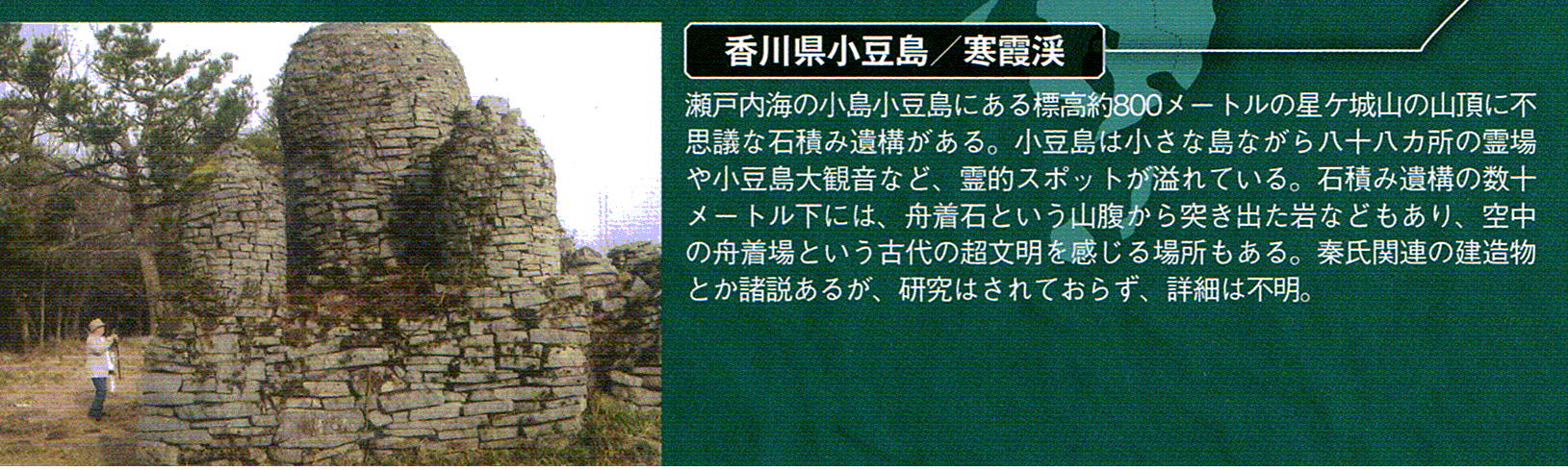 小豆島の私の家の裏山のパワースポットも不思議ですが、私が昔から不思議に思っている石積みが小豆島の頂上にあります。超古代ミステリー「日本のムー遺跡・日本に残るピラミッドとストーンサークル」という項目にその不思議の石積みが紹介されていた。これが雑誌で紹介されたのは初めてではないでしょうか?形としてはイスラム建築様式なんですがイスラムと小豆島は関係無いし、豊臣秀吉の時代に小豆島をキリスト教の聖地にしようとした宣教師はこんな形は造らないだろうし、いくら考えても答えの出ない石積みなんですよね、これ。それにしても編集者はよくこれを見つけたな。ほとんどの人はここまでは行かないのに。まあ、最近は道路事情が良くなり昔よりはるかに行きやすくはなっているが。私は高校時代に一人で何回もここまで歩いて登っていった。頂上から下界を見下ろすことで、なんとか自分の心の崩壊の危機から救った。これはほぼその場所にある。