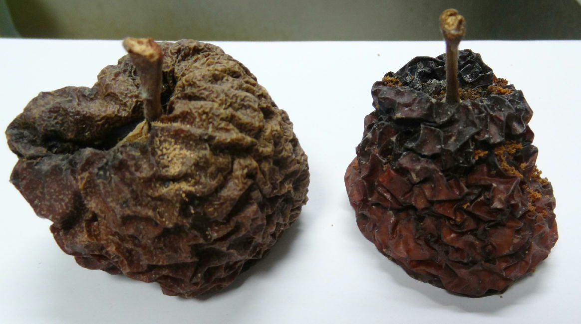 これ、何の写真か分かりますか?かなり以前にブログに載せましたが。左は3年前のリンゴ、右は1年前のリンゴです。私の部屋ではリンゴは腐らないのです。右のリンゴは廊下に置いていた箱の中で腐り始めたのをダイニングに移したら腐るのが止まりました。腐り始めていた部分が黒くなっています。