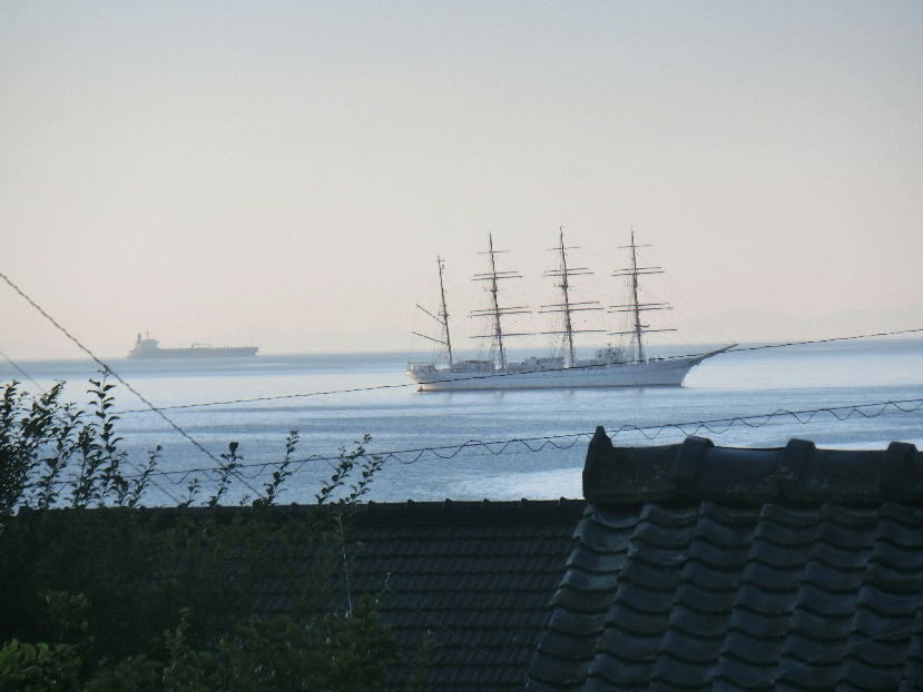 我が家の門から見える帆船。毎年、ここが帆船訓練休息場所みたいです。