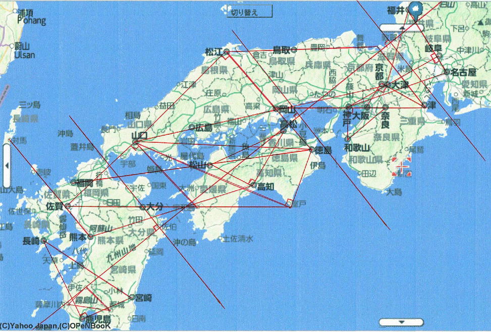 直線上に並ぶ都市、直角三角形を作る、直角二等辺三角形を作る都市の線。こんなの数学的に偶然的必然性として解けるのでしょうか?それとも神技?これで見ると西日本の背骨は39度になりますね。二重丸の都市が26個あります。同じく26個の石をばらまいて同じような数の直線や直角三角形が出来れば偶然の必然性になりますね。どうなんでしょう?ちなみにこのような都市の直角三角形性はアイルランドでも作れます。ドイツでも少し。他の国ではどうなんでしょうね~?ほとんどのすべての国で同じなら数学的問題になりますね。日本の場合、東北でもバッチシ、作れます。関東は都市が多すぎて調べられません。