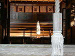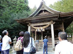 二日目の朝7時頃、境内で朝礼と室外行修が終わった後に、私が本殿に挨拶した後だったか?「村長さん、社殿に光が!」と誰かが声をかけてくれて振り向いたら、本殿の中央に光がピンポイントに差してきた。ほんの30秒程の神々しい光だった。それにしても本殿と拝殿の間に隙間を空けるのはこういう意味だったんですね。