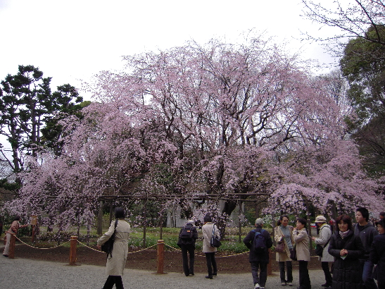 4/24、2時過ぎのしだれ桜。曇っているけど、明日は雨という予報もあるし・・・。