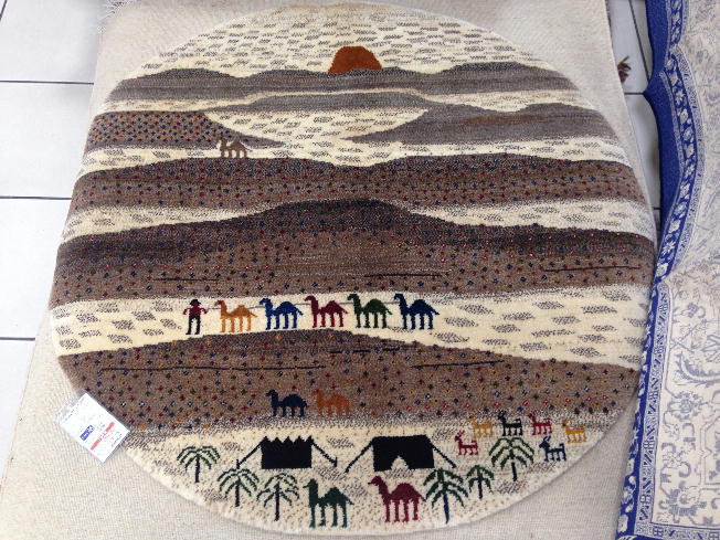 四角のカーペットに生活の景色を模様にして丸く絨毯を織り込んでいる。