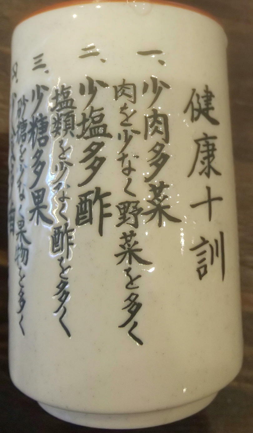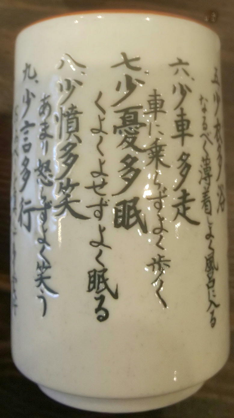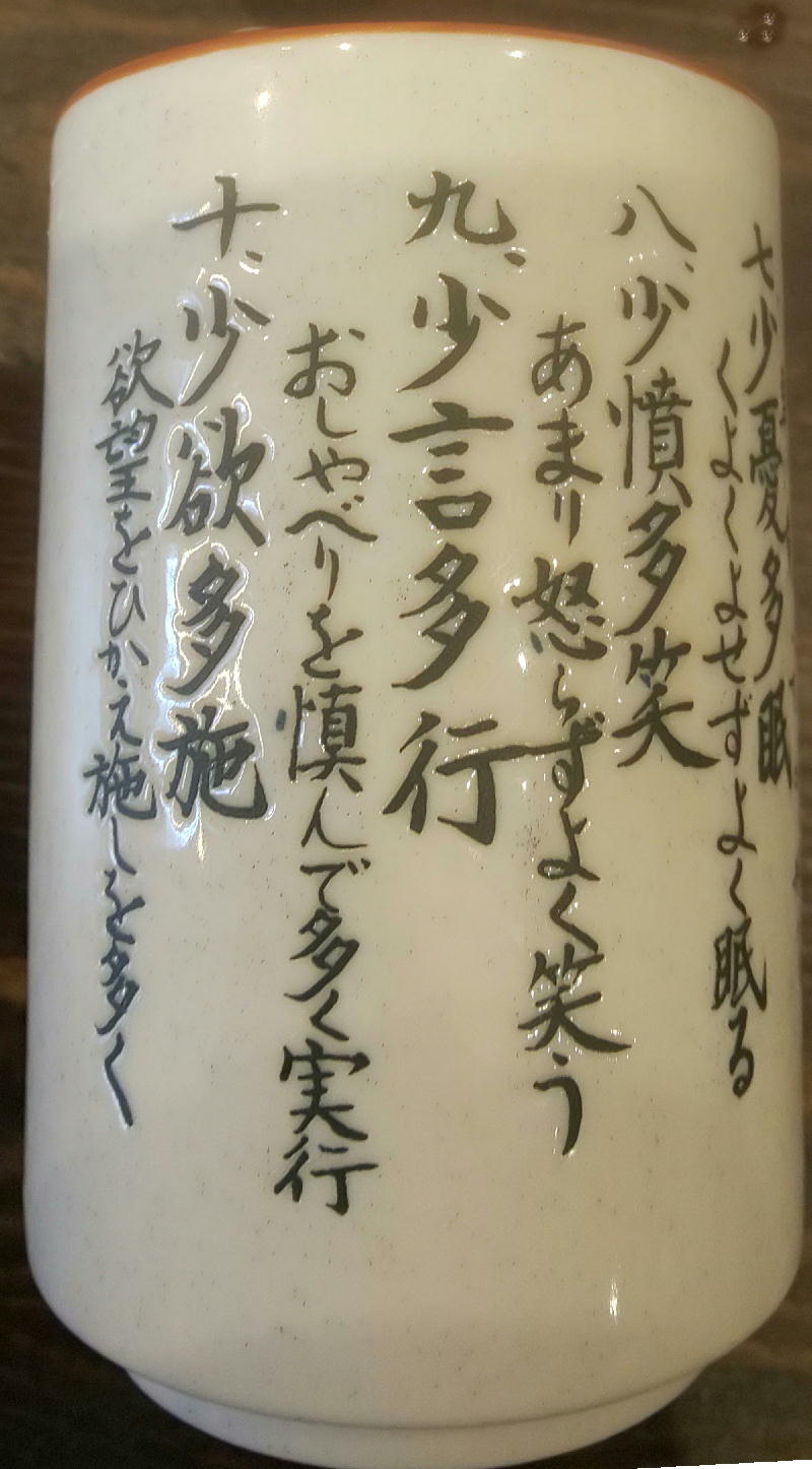 今日新宿でランチのために行った目当てのうどん屋は人がいっぱい並んでいたので、ちょっと気になっていた干物定食屋で湯呑に書かれている面白い言葉を見つけました。