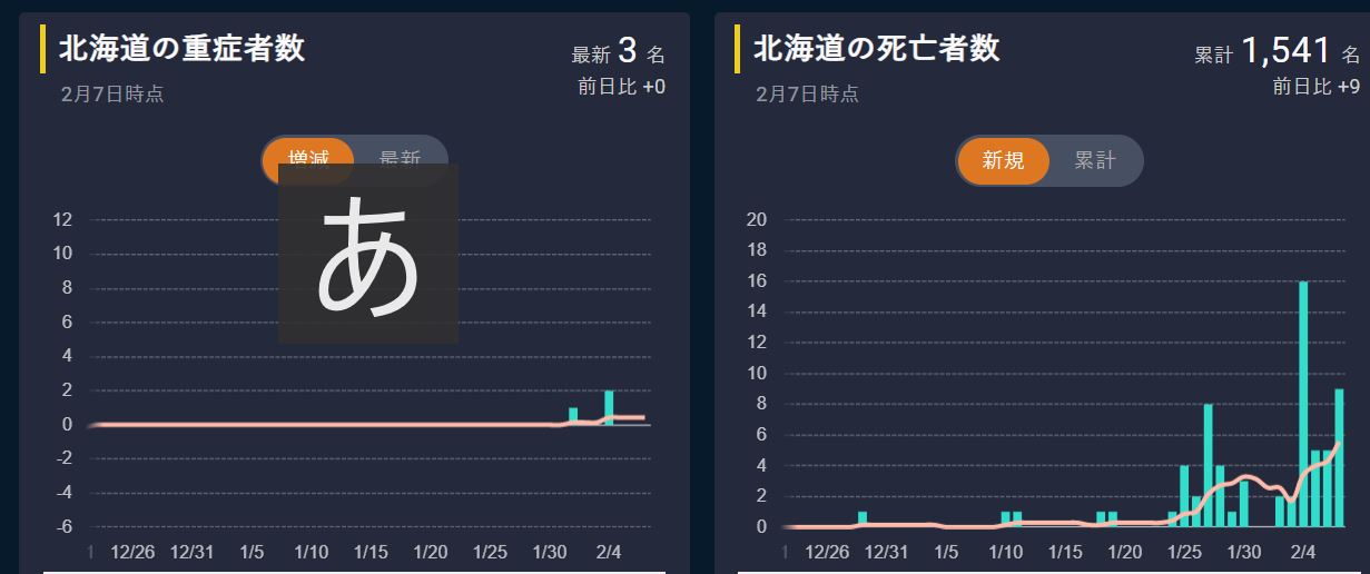 北海道も重症者がほとんどいない状態が続いているのに何で死亡者がこんなにも生まれるのだろう?補助金を貰うために老衰で亡くなった人も無理やり陽性にしているんじゃないかな~?おかしいよね。東京ではワクチンを打つと景品が貰えるとか?群馬ではワクチンを打った若者に抽選で1名車をプレゼントとか?大阪でも何か景品を書いていたな?ますます怪しい。そういうのをおかしいと思わないのが私には理解出来ない。景品を出すお金があるならワクチンを打って亡くなった人に補償してやれよ!と言いたい。「ワクチンを打つと重症化しない。打たないと重症化する確率が高い。なのでワクチンを打った方が良い。」という意見もあるだろう。それは自己責任による自己判断でいいではないか?