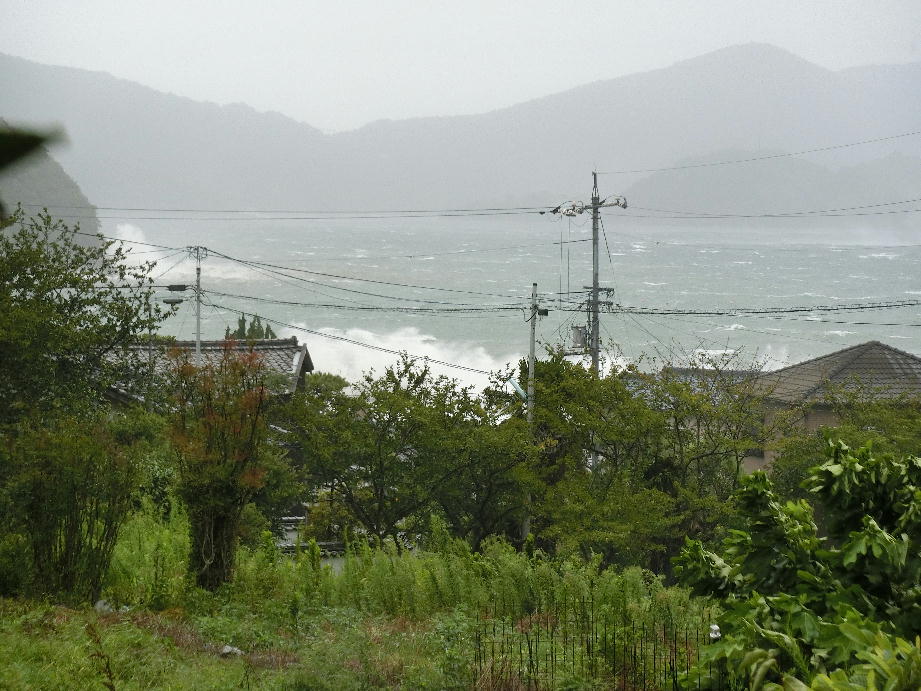 我が家のトイレの窓から見る15日と16日、それぞれの朝。台風の最中は門を開けて写真を撮れない。