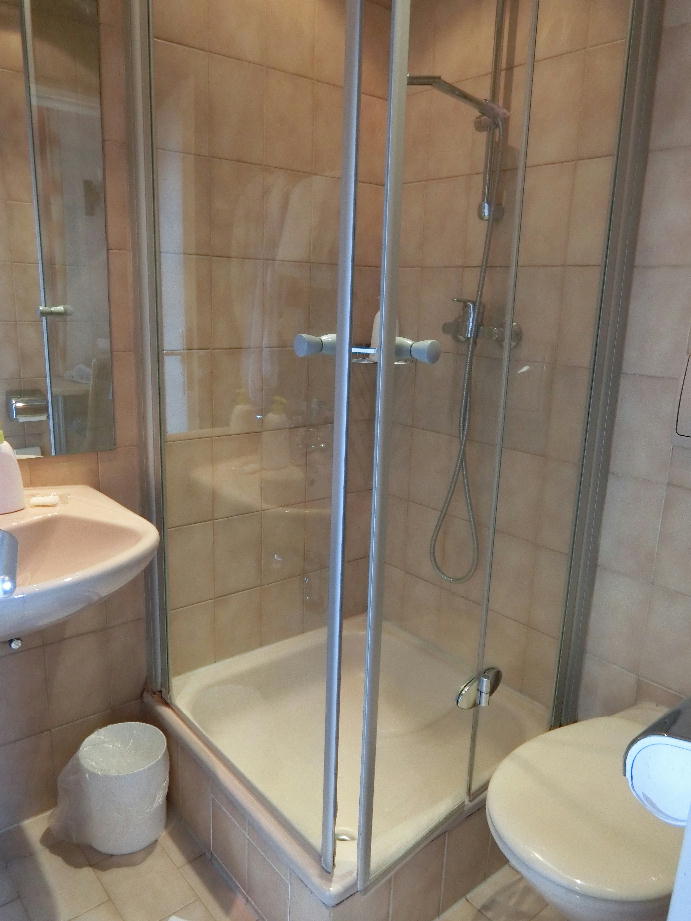 このシャワー室には驚いた。ガラスドアを両方を丁寧に開かないと入れないし、洗面台や便器にぶつかって割れそう。太い人間は便器に座れない。
